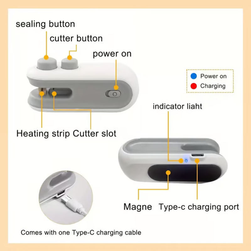 The bag sealer is equipped with a built-in battery. Compared with old-style heat sealer machines, this bag heat sealer is more powerful, cost-effective, and environmentally friendly, eliminating the need for battery replacements! A full charge takes 2 hours and lasts 10–15 days, depending on usage frequency. TYPE C cable included!